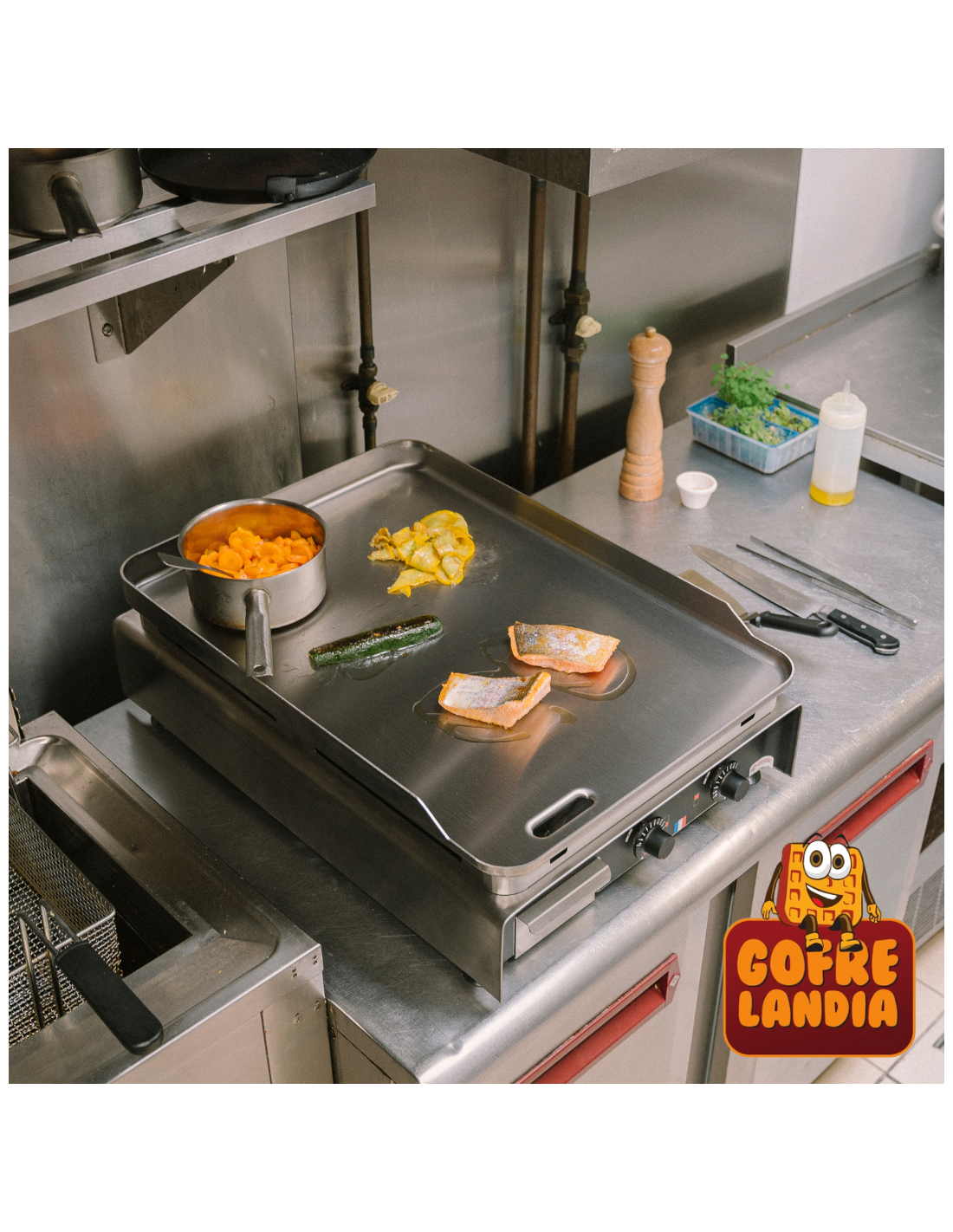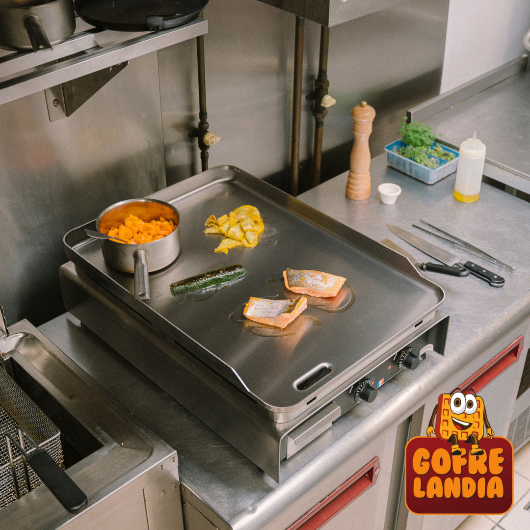 Concebida para integrarse perfectamente en configuraciones estándar de cocinas profesionales, esta plancha destaca por su versatilidad y eficiencia. Su diseño incluye dos amplias zonas de cocción independientes, permitiéndote realizar preparaciones simultáneas a distintas temperaturas.